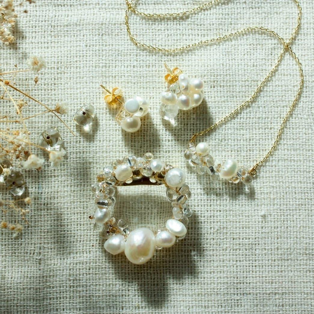 「今日は少し、気分を上げたい」そんな日にそっと寄り添う、明るくきらめくビーズ刺繍アクセサリーを展開しています。やわらかな色合いにゴールドの輝きを添えた、大ぶりで華やかなデザインを特徴とし、ひとつひとつ丁寧に仕立てています。いつもの装いに少しだけ非日常のきらめきを添えて、自分らしさを楽しむきっかけになりますように。特別な日にも、何気ない日にも、ぜひお気に入りを見つけにいらしてください。