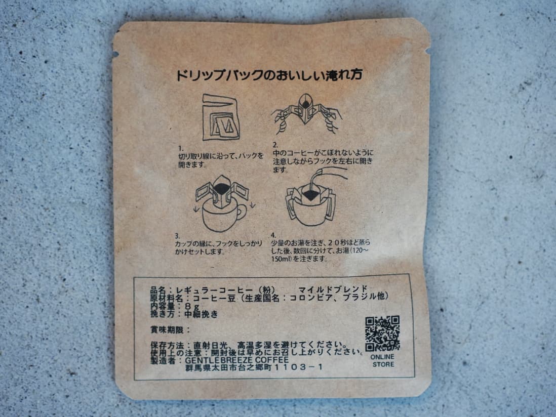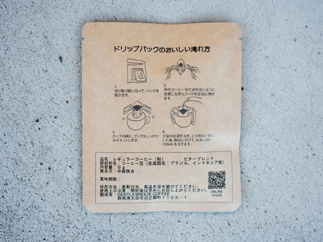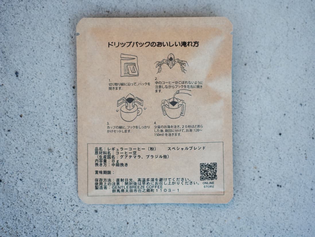 38 コーヒー ドリップパック(3種) ¥580 GENTLE BREEZE COFFEE オリジナルブレンド(スペシャル)のドリップバッグを3種の詰め合わせ。カップに乗せてお湯を注ぐだけでお召し上がり頂けます。旅行先、出張先、キャンプやピクニックなどのアウトドアシーンでも簡単においしいコーヒーをお楽しみいただけます。 販売:GENTLE BREEZE COFFEE